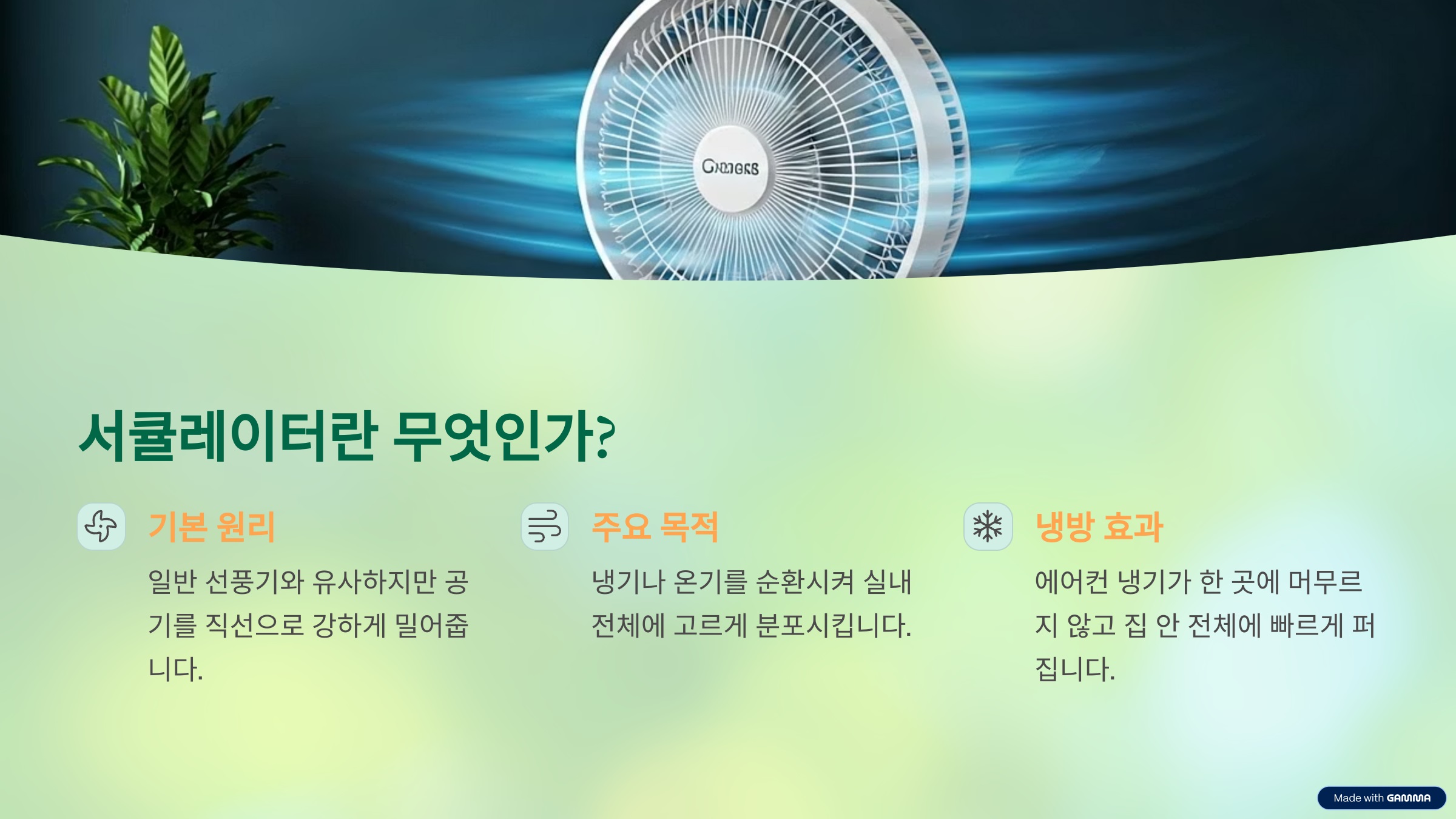 서큘레이터는 일반 선풍기처럼 생겼지만, 공기를 직선으로 강하게 밀어주는 기기입니다.