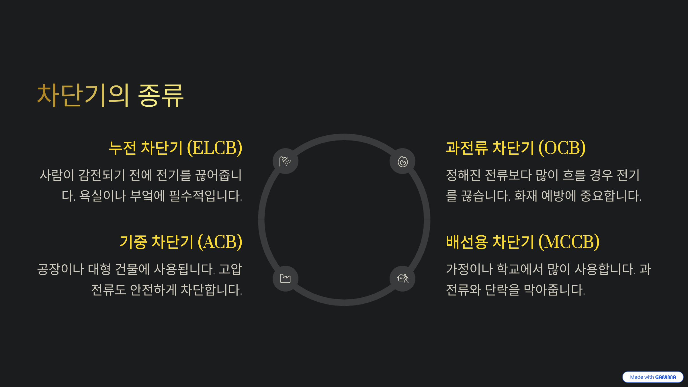 우리가 전기를 편리하게 사용할 수 있는 이유는, 이런 차단기들이 문제가 생기기 전에 먼저 막아주기 때문이에요.